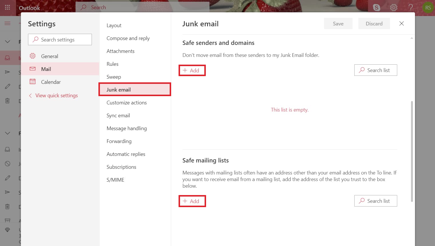 - 2. Go to “Junk email”, then choose “Safe senders and domains” or “Safe mailing lists” to select the domain or email you want to whitelist.