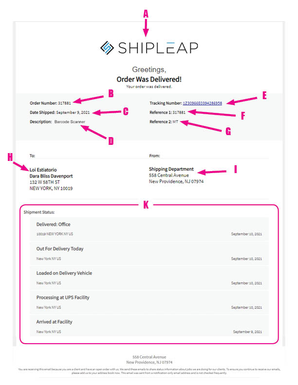 {%ROW_MESSAGE%} - In section K, the message that says Delivered: Office, Out For Delivery, Today, etc.