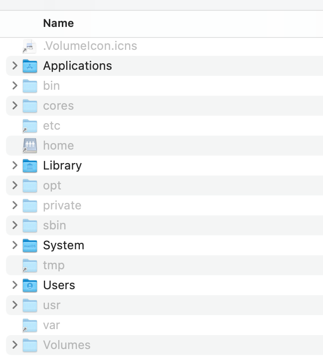 2. Hold down Command + Shift + . (period) keys at the same time (to see hidden files/folders). You can tell it worked if the screen looks something like this.